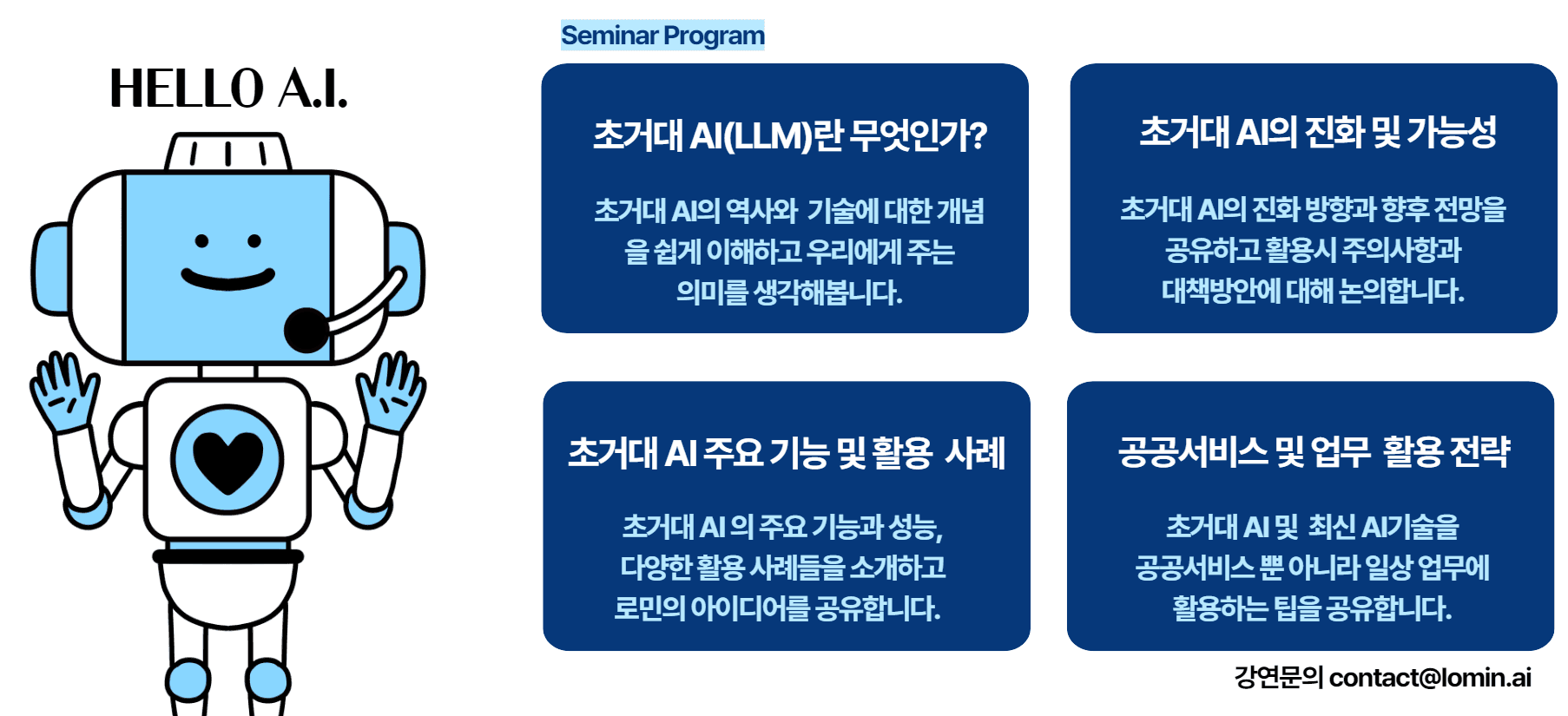 로민은 국내 유수 대기업 및 공공기관에 AI 솔루션을 공급해 온 전문기업으로, 공적기관 및 기업체를 대상으로 AI 기술에 대한 이해를 돕기 위한 강연 및 세미나를 진행하고 있습니다.