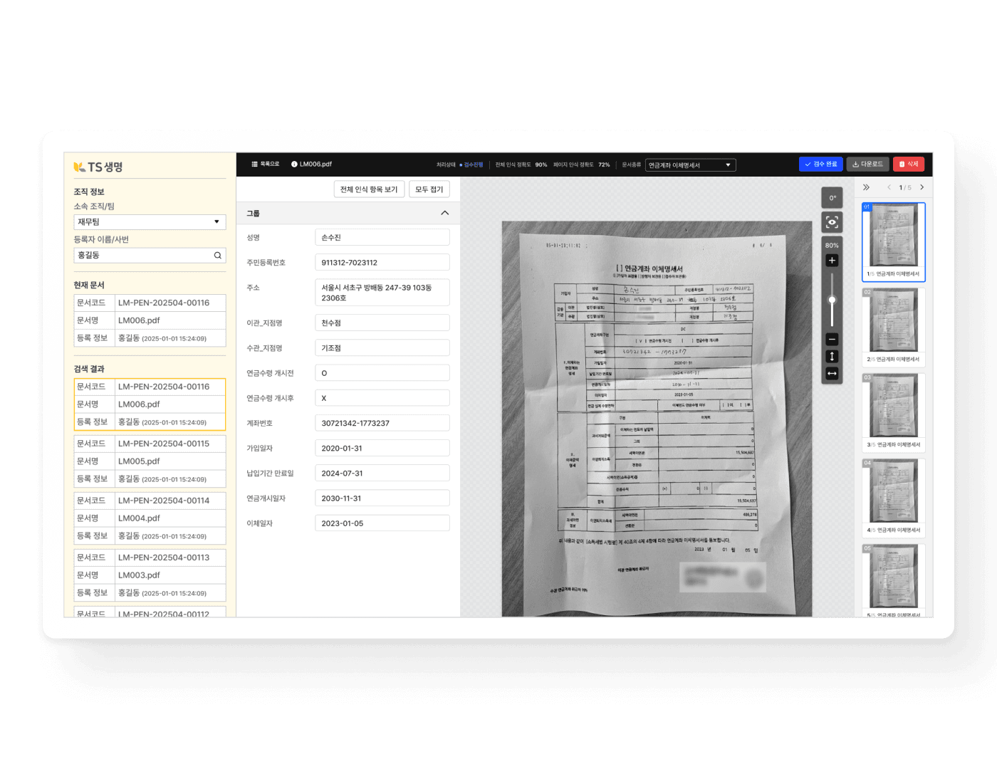 썸네일 뷰 기능을 통해 시각적 탐색이 가능해 대량의 문서도 효율적으로 검수 가능